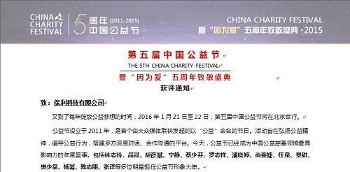 近日,经第五届中国公益节评委会审议,保利科技获评“2015年度公益传播奖”。