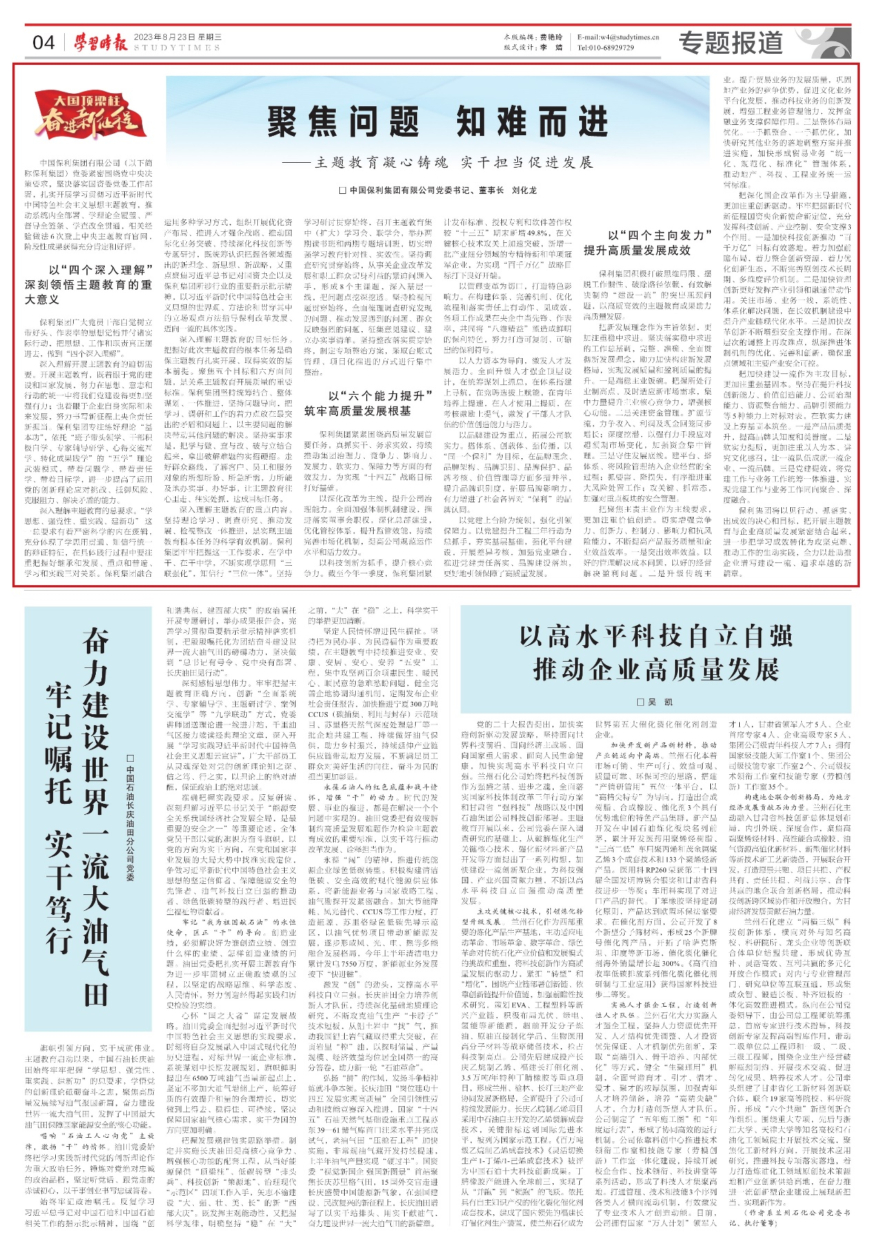 8月23日,《学习时报》刊发保利集团党委书记、董事长刘化龙《聚焦问题 知难而进——主题教育凝心铸魂 实干担当促进发展》署名文章。文章指出,保利集团坚决落实国资委党委工作部署,扎实开展学习贯彻习近平新时代中国特色社会主义思想主题教育,以“四个深入理解”深刻领悟主题教育的重大意义,以“六个能力提升”筑牢高质量发展根基,以“四个主向发力” 提升高质量发展成效,阶段性成果获得充分肯定和好评。未来,保利集团将进一步把主题教育的成果成效转化为攻坚克难、推动工作的生动实践,全力以赴助推企业谱写建设一流、追求卓越的新篇章。