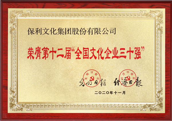 11月16日,光明日报社和经济日报社在北京联合发布了第十二届“全国文化企业30强”名单,保利文化集团股份有限公司成功入选名单。这是自2008年起,保利文化第11次荣膺该项荣誉,品牌得到社会广泛认可。
