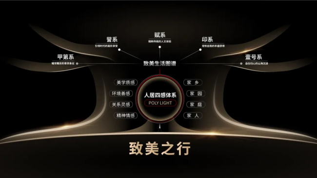 “保利是吾乡”品牌发展战略,即以产品和服务为核心触点,以文化和责任为基石和愿景,打造具有卓越竞争力的品牌生态链,实现从空间到感知,从情感到情境,从吾家到吾乡,从小家到大国的全面升级。POLYLIGHT·人居四感体系,即从美学质感、环境善感、关系灵感、精神情感四重价值坐标出发,将“美”赋能于产品。从城市到山海,从东方到国际,甲第系、誉系、赋系、印系、壹号系将共同谱写保利置业“致美生活图谱”。