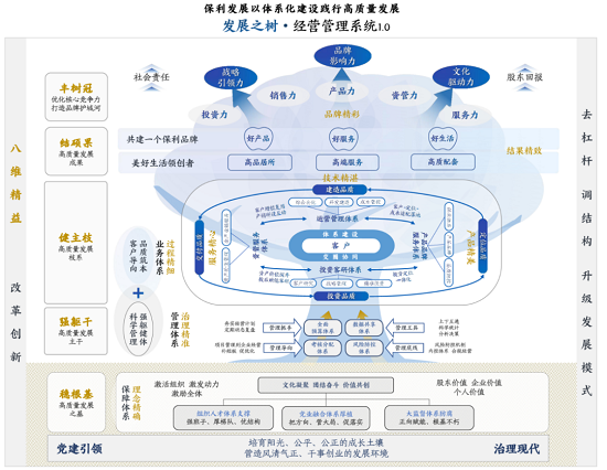 保利发展从服务国家战略、提高核心竞争力、增强核心功能及发挥“三个作用”的角度出发,创新性地构建出一套具有保利特色的“发展之树”经营管理系统,聚焦“稳根基”、“强躯干”、“健主枝”、“结硕果”、“丰树冠”五个部分,将“八维精益”管理理念有机融入,致力于对组织能力和治理水平进行全面升级,引领公司高质量发展。