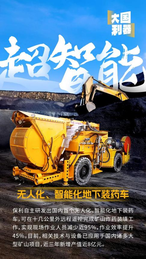 深藏地下百米的地下矿洞中,一辆身穿黄色“工装”的混装车正徐徐前进,它的视线实时回传到了十几公里外的操作室内,协助操作员完成对孔装药作业。这里是被誉为“地球上矿物学家的天堂”的广西南丹县大厂镇,蕴藏矿物百余种,保利打造的国内首个无人化、智能化地下装药车成为了地下矿藏世界的智慧大脑,高效安全保障矿山作业,助力国家能源建设。