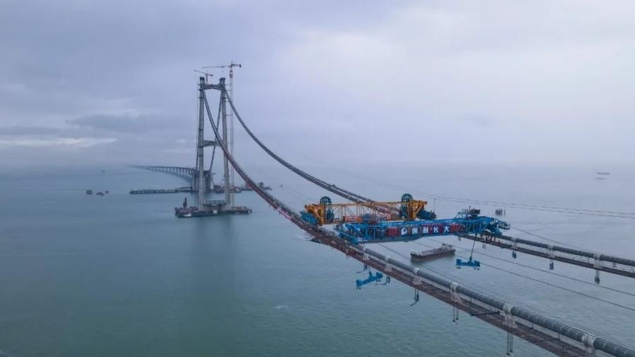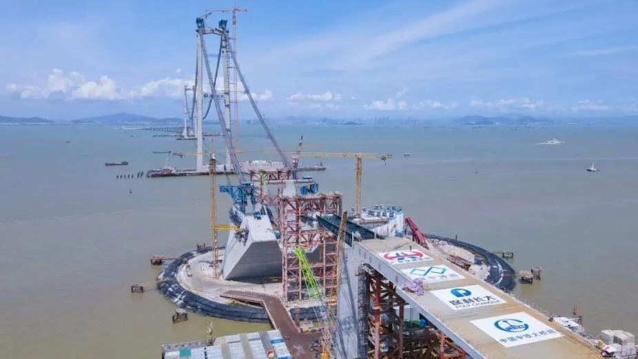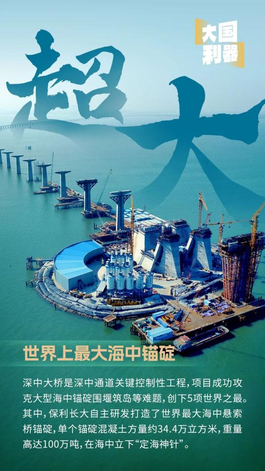 有了建设方案,保利长大开启了与海相伴的“死磕”模式。2018年12月,建立起世界上首个柔性锚碇人工岛,为后续五年锚碇施工打下基础;2021年2月,实现15天完成4.5万立方米混凝土,创下连续浇筑国内纪录;2022年11月,历经5次台风和持续高温影响,完成西锚碇钢箱梁顶推施工……历时五年,这座重达100万吨的世界最大海中锚碇最终成型。