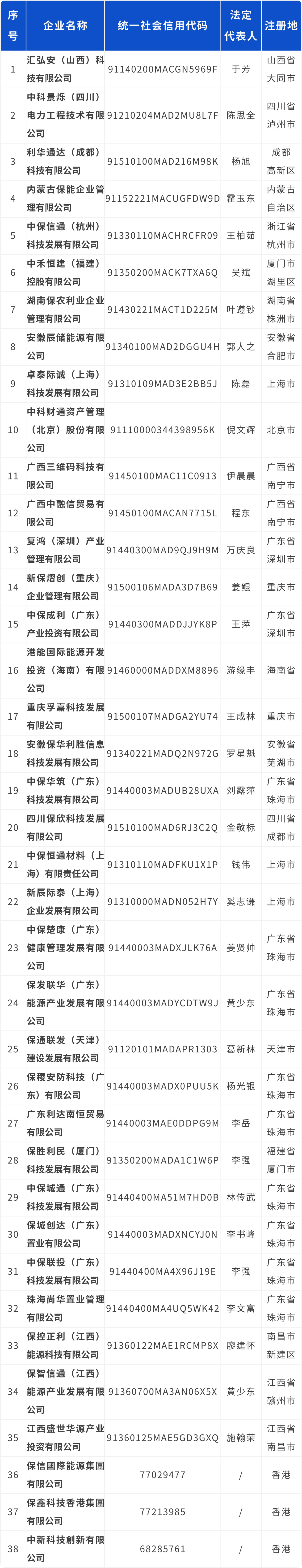 经保利集团核实,下表所列公司及其下设各级子公司均与保利集团及所属公司无任何隶属与股权关系,也不存在任何投资、合作、业务等关系,其一切行为均与保利集团无关。请广大社会公众提高警惕,注意防范风险,如发现其违法犯罪行为,请尽快到公安机关报案。