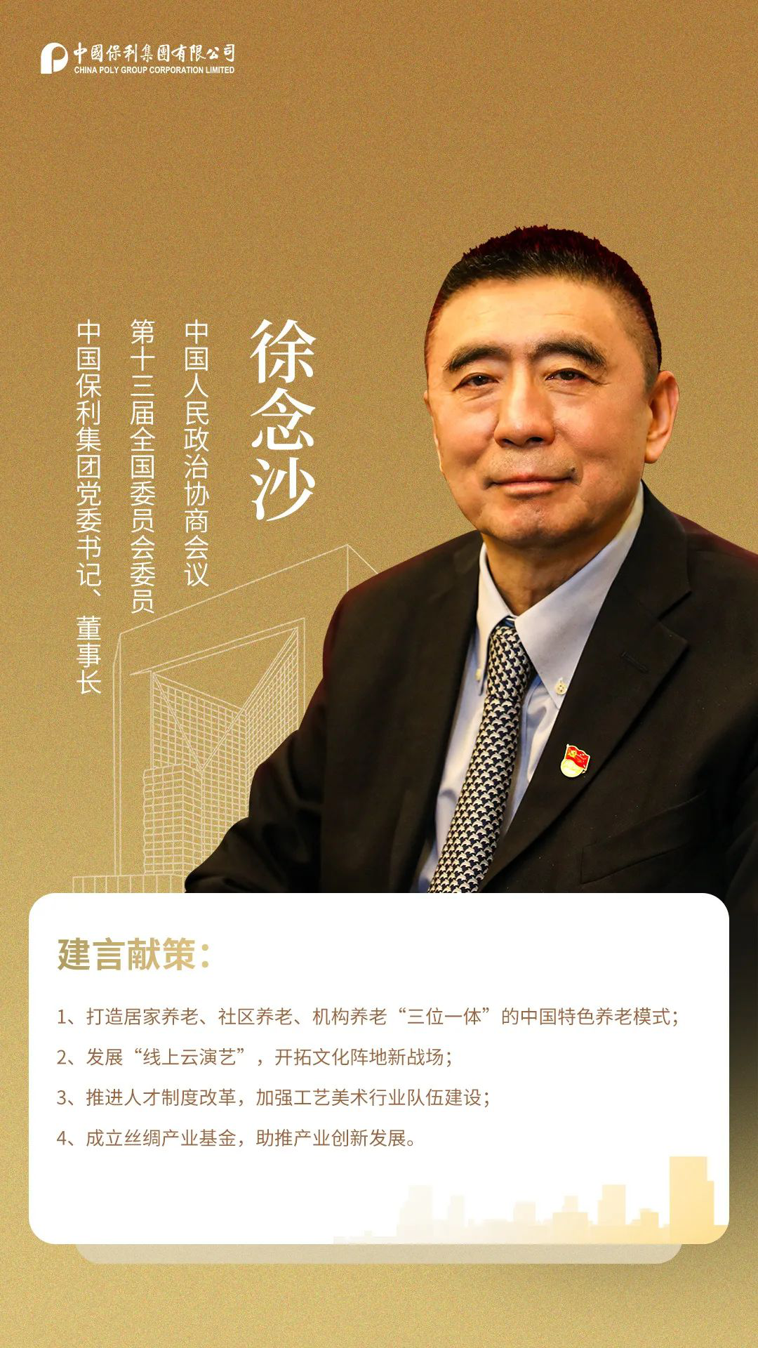 4日15时,全国政协十三届四次会议开幕会在人民大会堂举行,习近平等党和国家领导人出席。全国政协主席汪洋代表政协第十三届全国委员会常务委员会作工作报告。来自34个界别的2000多名全国政协委员齐聚北京、共商国是。全国政协委员、中国保利集团党委书记、董事长徐念沙参加开幕会,并将在两会期间积极建言献策,依法履职,发出保利好声音。